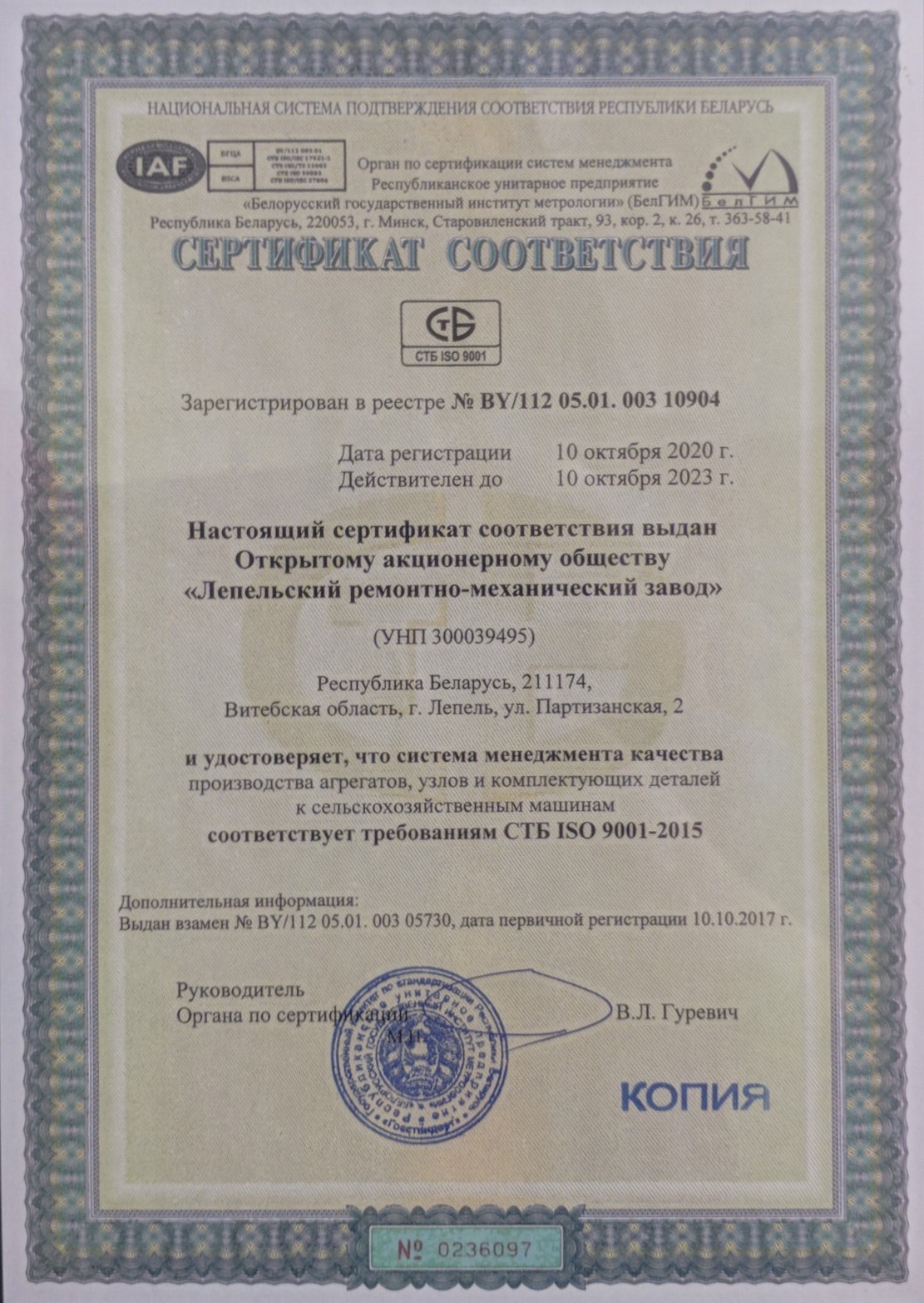 На ОАО «Лепельский РМЗ» сертифицирована система менеджмента качества производства узлов, агрегатов и комплектующих изделий к сельскохозяйственным машинам по версии СТБ ISO 9001-2015.